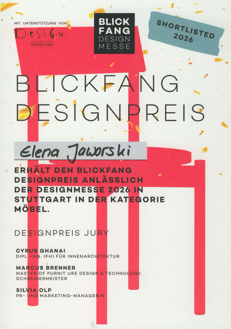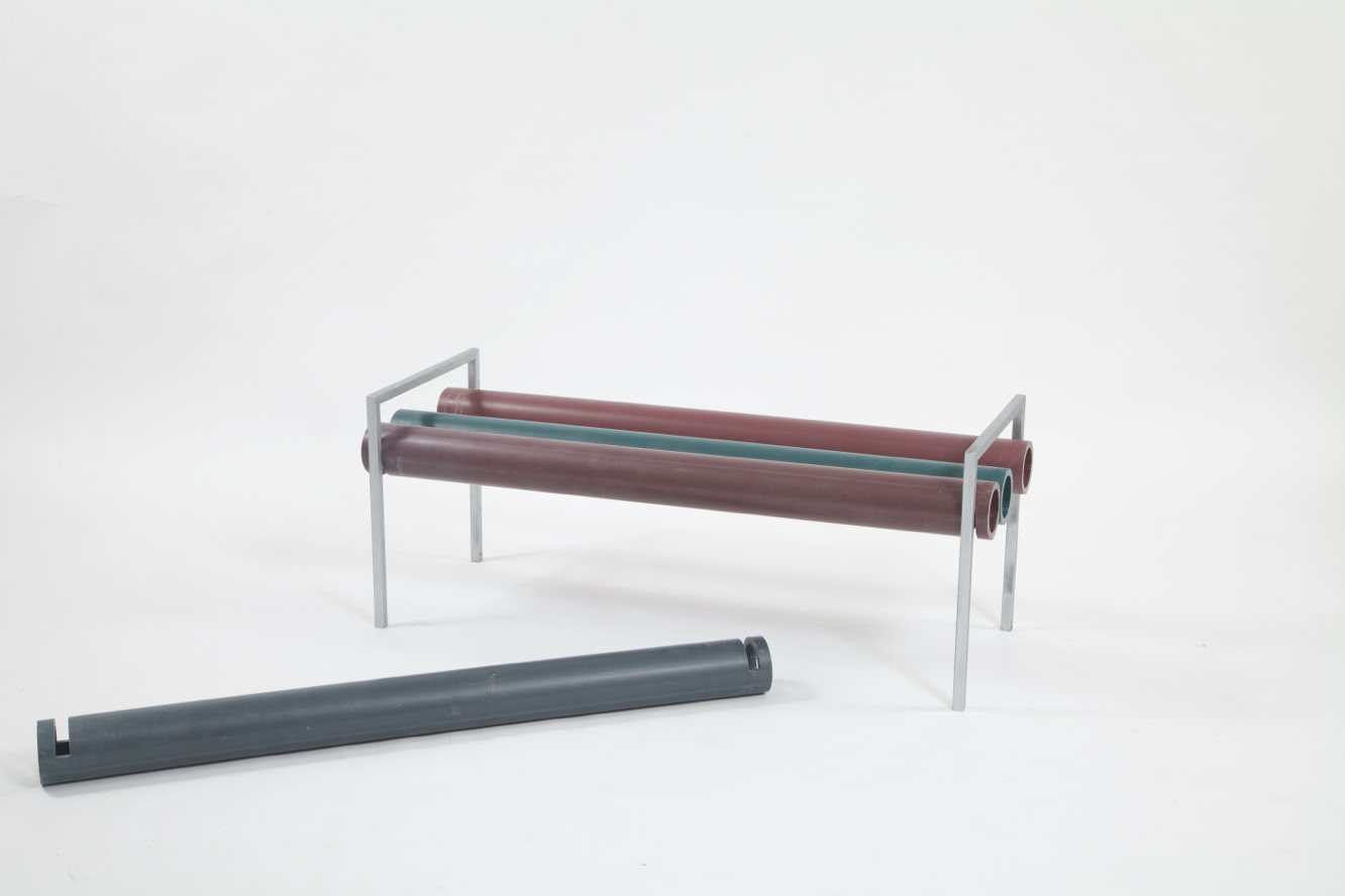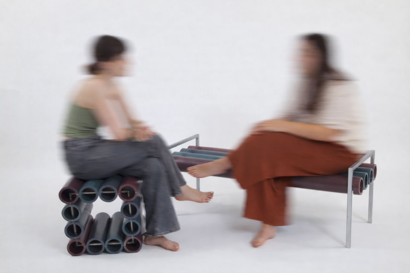 Der Entwurf lebt vom spannungsvollen Zusammenspiel der Materialien: robuste Kunststoffrollen treffen auf eine filigrane Unterkonstruktion aus Restmetall. Die natürlichen Farbnuancen der Rollen machen jede Bank zum Einzelstück. Gleichzeitig folgt die Gestaltung einem Prinzip radikaler Einfachheit: Mit nur vier Schrauben konstruiert, lässt sich das Möbel vollständig zerlegen und weiterdenken. Die „Erntebank“ steht damit exemplarisch für einen bewussten, zirkulären Umgang mit Ressourcen – und zeigt, wie aus Abfall durch kluges Design neue Werte entstehen können.