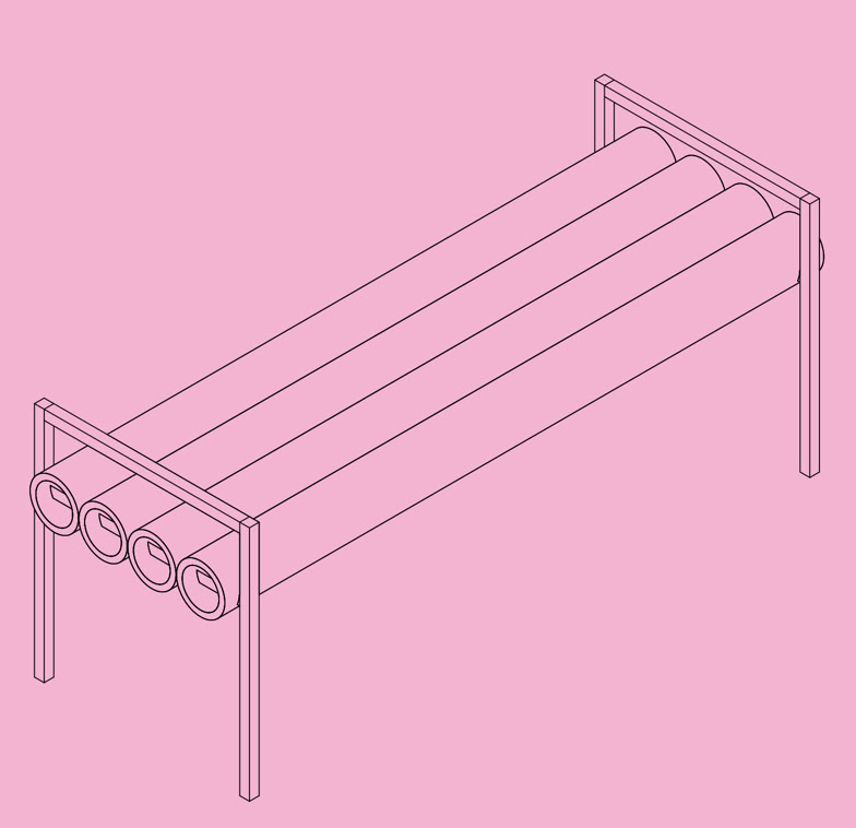Eine filigrane Unterkonstruktion aus Restmetall sorgt für die notwendige Aussteifung und bildet einen klaren Rahmen, der bewusst mit den robusten Rohren kontrastiert. Mit nur vier Schrauben lässt sich das Möbel vollständig montieren und wieder zerlegen.